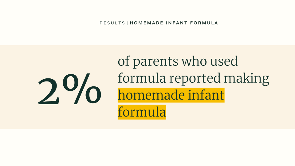 Respondents using homemade infant formulas were utilizing recipes found online (35%), from a medical professional (19.4%), or from a parent/friend (16.1%).