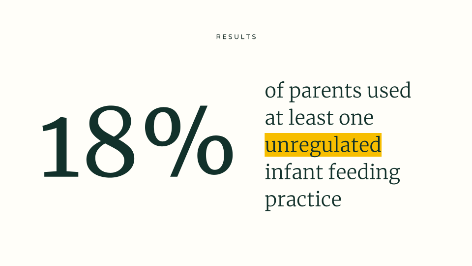Nearly one of every five parents responding to a recent infant feeding practices survey reported using at least one unregulated infant feeding practice. The practices reported are contraindicated based on expert and regulatory guidelines and present nutritional and safety risks. Many respondents admitted to not discussing these infant feeding practices with their infant's pediatrician.
